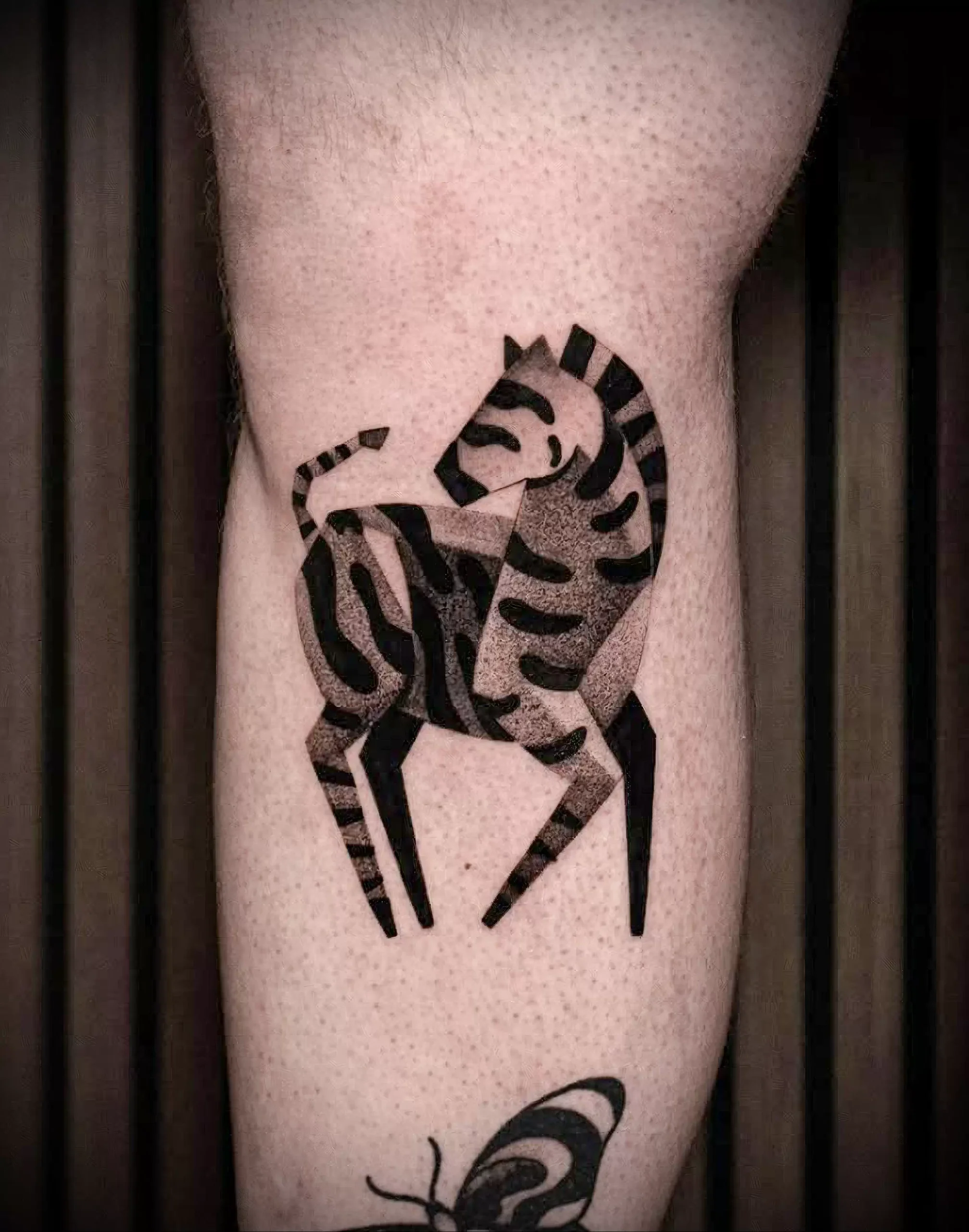 This tattoo showcases a modern and innovative take on the classic zebra motif, rendered in a striking geometric style. The design is characterized by its fragmented shapes, bold lines, and the use of dotwork shading to create texture and depth. The artist has skillfully deconstructed the zebra’s form, creating a visually dynamic and engaging composition. The placement on the calf allows the design to flow with the muscle structure.