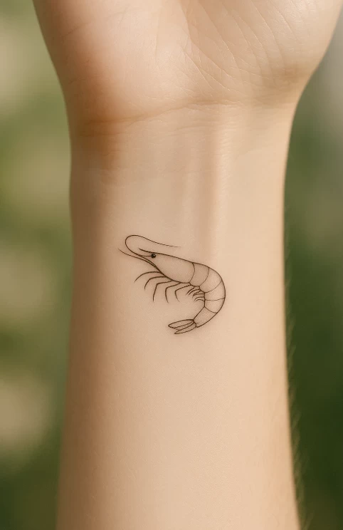 This tattoo is a testament to the power of simplicity. The shrimp is rendered with a single, continuous line, creating a delicate and elegant effect. The composition is minimalist, focusing on the essential form of the shrimp. The color palette is limited to black ink on skin, emphasizing the purity of the design. The placement on the wrist allows for a discreet yet visible display of this understated tattoo art.
