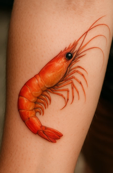 Shrimp, as a symbol, can represent adaptability, resilience, and resourcefulness. The realistic style of the tattoo suggests a reverence for nature and a desire to capture the beauty of the natural world.