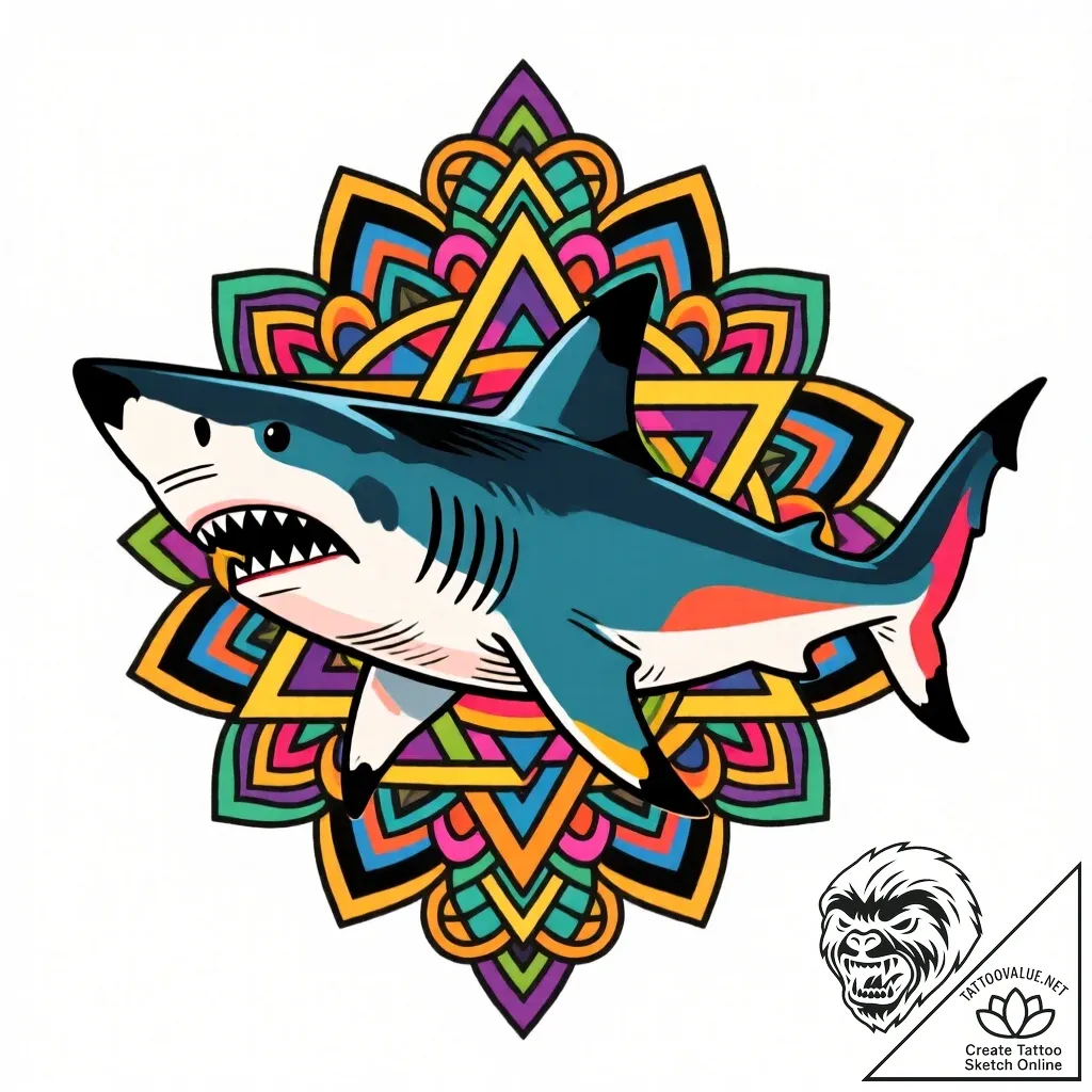 tattoo sketch, tattoo design, isolated tattoo sketch on pure white background, A striking hammerhead shark illustration, meticulously crafted as a tattoo design. The artwork explodes with vibrant color, encompassing the full color spectrum and utilizing bold, bright tattoo inks. Rendered in a geometric tattoo style, incorporating sacred geometry patterns and intricate mandalas interwoven with abstract shapes. The composition is perfectly symmetrical, defined by bold outlines, thick lines, and heavy linework, all presented on a clean white paper background, isolated for maximum impact. Highly detailed, high resolution.