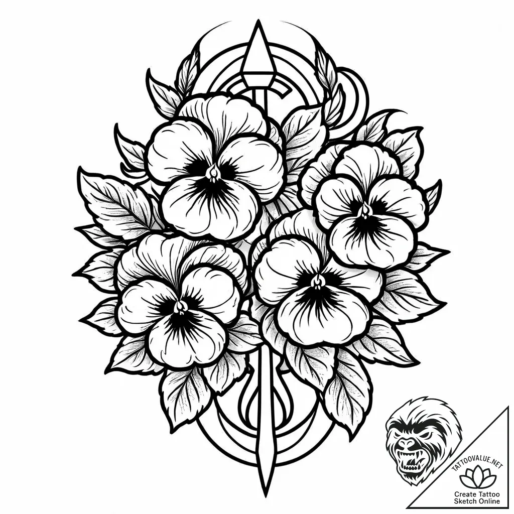 This striking tattoo sketch blooms with a cluster of pansies, their velvety petals rendered with bold, thick linework reminiscent of classic American Traditional style. The heavy outlines give the flowers a graphic, almost sculpted presence, while the subtle shading on the leaves adds depth, evoking a sense of enduring beauty against a dramatic, two-tone backdrop hinted at by the implied red accent. A sharp, stylized spear-like element pierces through the floral arrangement, adding an unexpected edge and narrative tension.