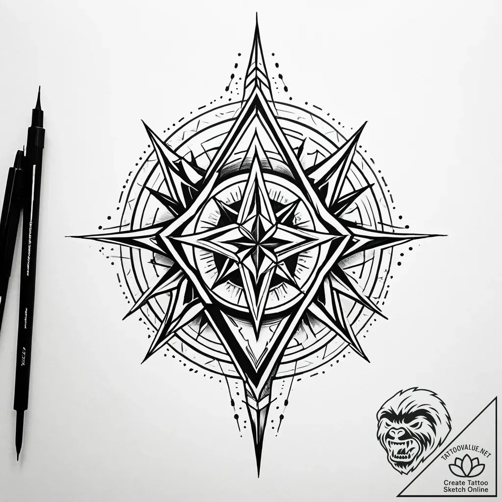 This intricate black and white sketch presents a striking compass rose, rendered with sharp, geometric lines and delicate single-needle work. Its design evokes a sense of arcane mystery, with radiati