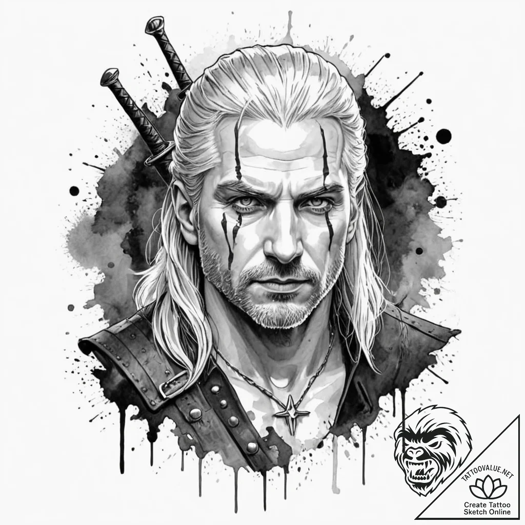 Presenting a unique tattoo sketch, created based on your request “ведьмак (the witcher – netflix version), tattoo line art, aesthetically pleasing, beautiful design, on white paper, clean white background, isolated on white, moderately detailed, balanced complexity, clear subject definition, professional artwork, expertly drawn, bold outlines, thick lines, heavy linework, black and white sketch, monochrome, greyscale tones, watercolor tattoo style, artistic splashes, vibrant blended colors, no outlines, abstract watercolor” at tattoovalue.net.