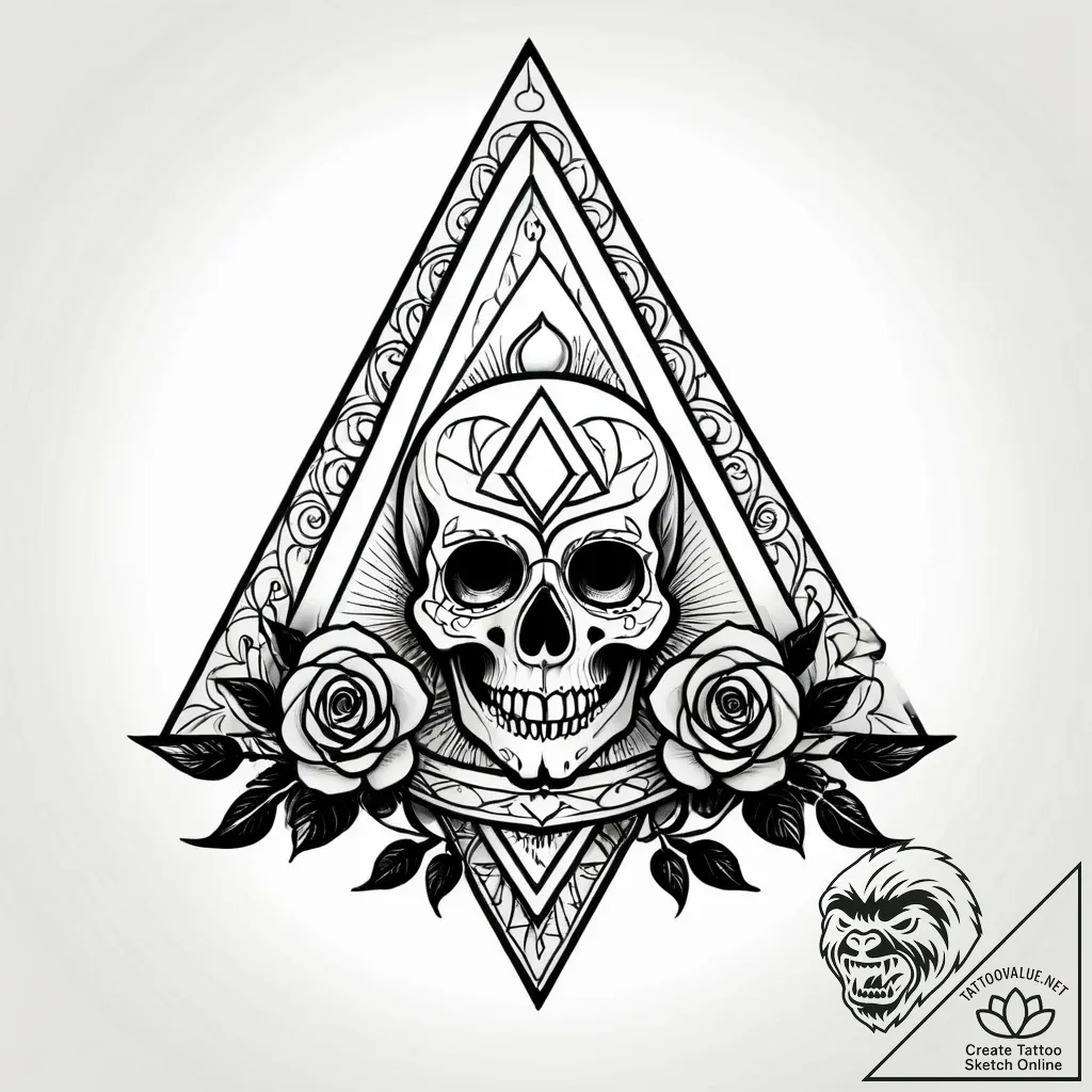 This sepia-toned sketch, rendered with crisp, fine-line black and grey linework, presents a striking Chicano-inspired design. A central skull, adorned with geometric patterns, rests within a triangular emblem, its stark gaze softened by the surrounding delicate roses. The composition evokes a sense of vintage mystery, like a fragment unearthed from an old diary, with intricate detailing that speaks to a rich, artistic heritage.