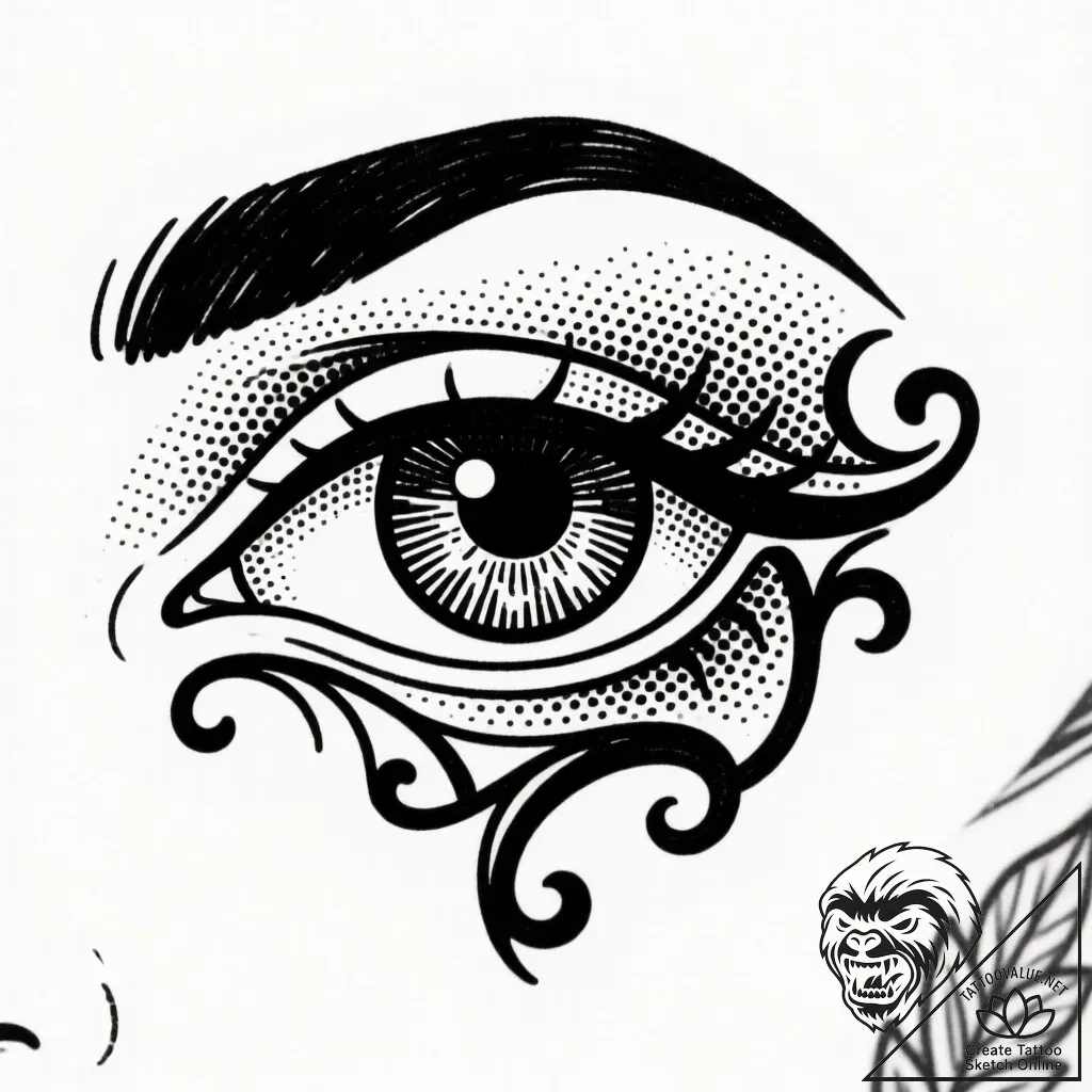 This Neo-traditional tattoo sketch is a striking depiction of an eye, rendered in bold black linework that evokes the illustrative elegance of Art Nouveau. The composition masterfully blends crisp lines with stippling and pointillism, creating a textured depth that suggests a hidden universe within the iris. It’s a graphic masterpiece, a watchful gaze brought to life with the intricate dance of dots and swirls.