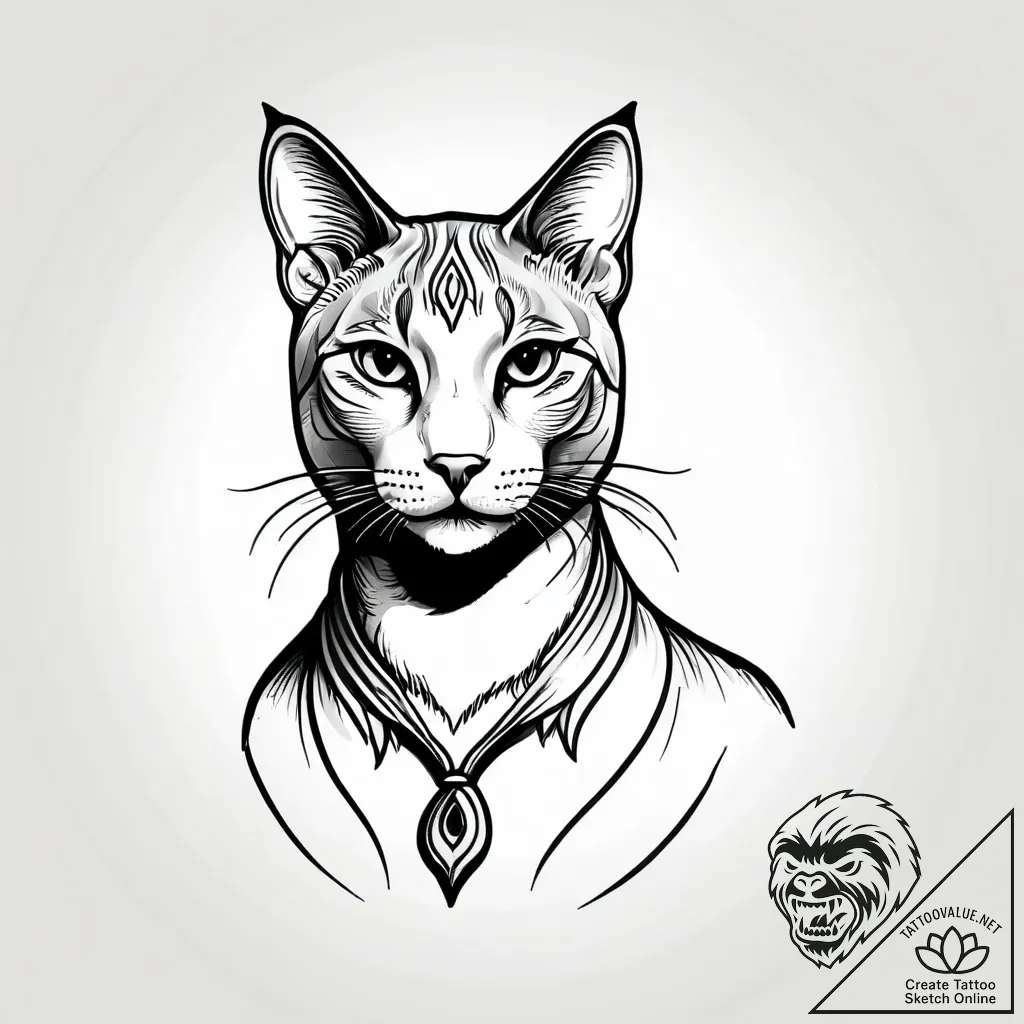 This sketch is a majestic portrait of an Egyptian cat, rendered in a sophisticated black and grey style with delicate whip and dot shading. The clean lines create a minimalist yet impactful design, capturing the feline's regal aura with subtle gradients that bring depth to its gaze and form. It's a piece that whispers ancient elegance through its simple, refined execution.