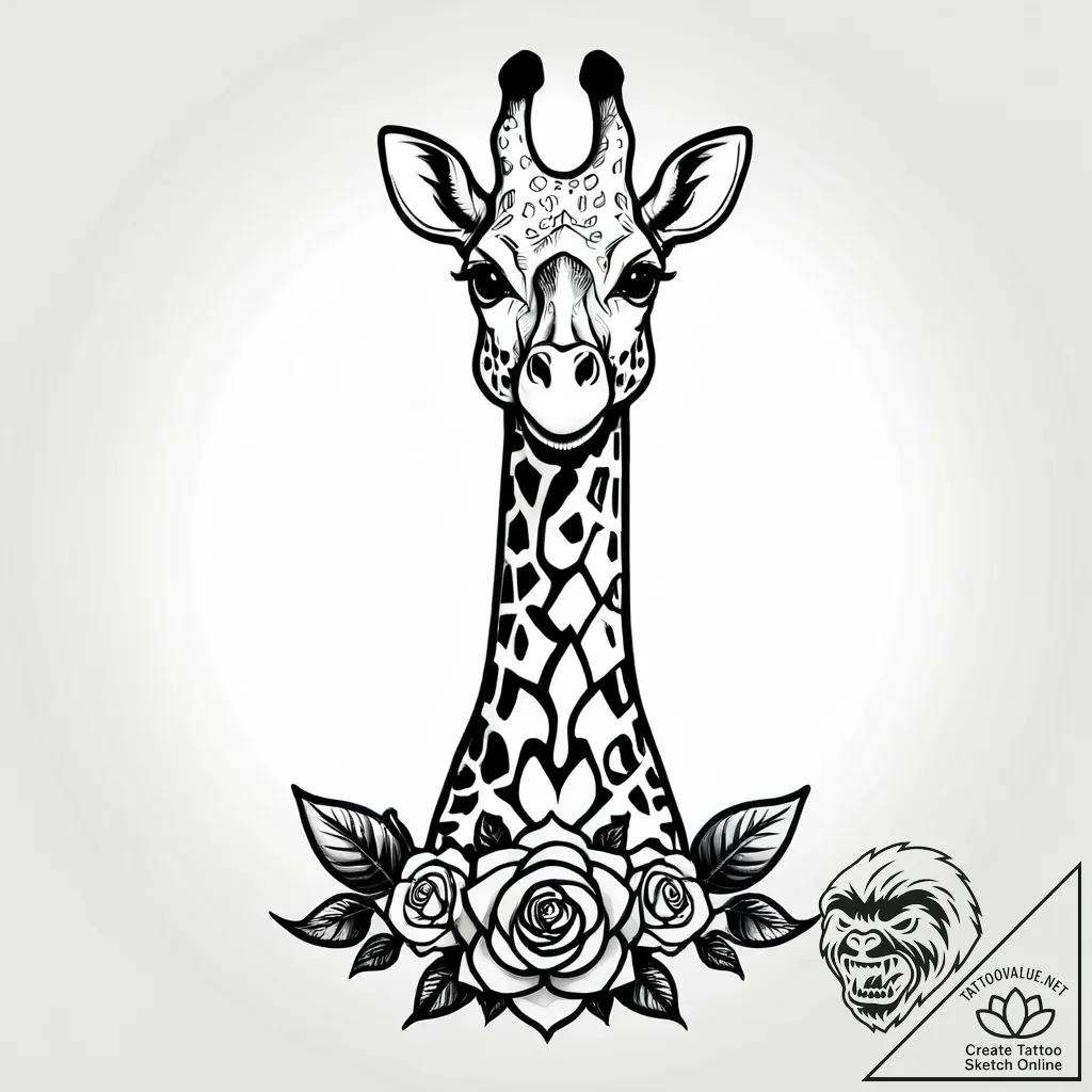 This Chicano-style sketch presents a giraffe's head as a regal emblem, its gentle eyes gazing forward while a crown of delicate roses and symbolic leaves adorns its base. Rendered in pure black outline, it's a testament to fine-line artistry, evoking a sense of serene strength. The composition is clean and striking, a monochrome symphony of linework that feels both ancient and contemporary.