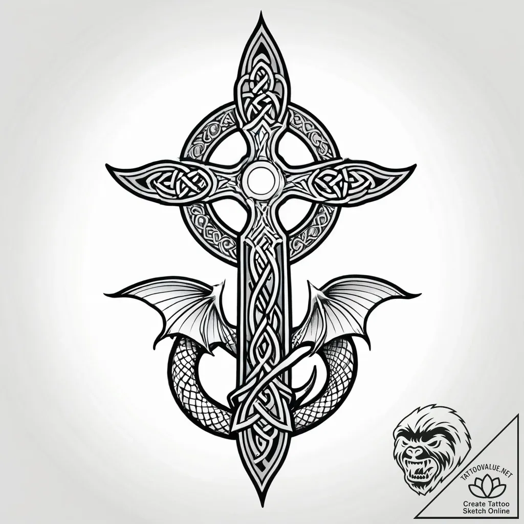 This sketch is a powerful fusion of ancient Celtic knots and fierce Irezumi symbolism, creating a visual narrative that feels both timeless and rebellious. The intricate, interwoven lines of the Celtic cross serve as a grounding element, while the emergent dragon, with its coiled body and watchful gaze, injects a primal energy, all rendered with a raw, hand-drawn pencil effect that lends a vintage, unfinished charm.