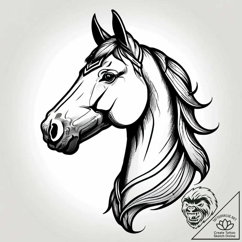 This striking tattoo sketch captures the noble spirit of the horse in a classic American Traditional style. Bold, decisive lines carve out the animal's form, while smooth grey shading lends depth and a sense of powerful musculature. The horse's head, presented in profile, feels both dynamic and serene, a testament to the artist's skill in balancing energy and grace.