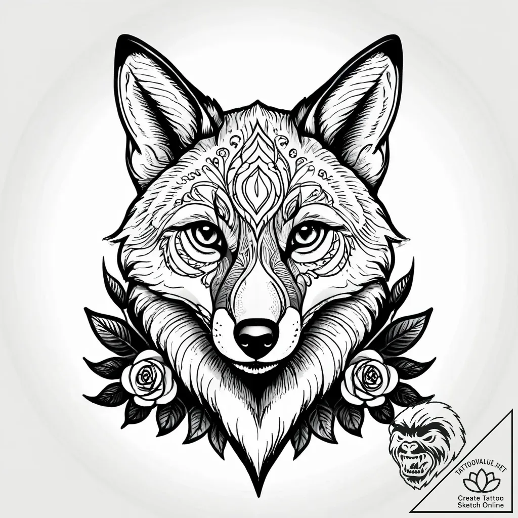 This is a striking Chicano-inspired tattoo sketch, a masterful blend of bold linework and delicate dotwork, creating a fox that seems to emerge from a tapestry of intricate patterns. The piercing gaze of the fox, framed by ornate decorative elements and flanked by classic roses and subtly implied skulls, evokes a sense of ancient wisdom and untamed spirit. The composition is a captivating dance between sharp outlines and the soft texture of stippling, giving the piece a dynamic, almost breathing quality.