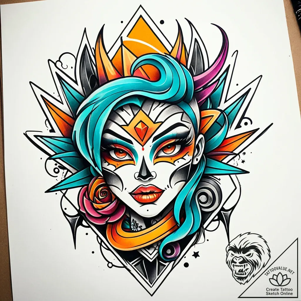 This New School tattoo sketch explodes with vibrant energy, a modern take on classic imagery. The exaggerated, cartoonish forms are framed by bold, thick linework, reminiscent of graffiti art, while a
