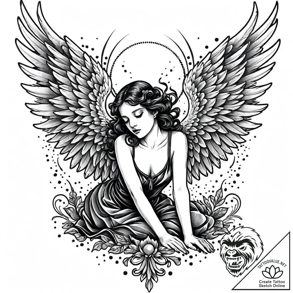 This fallen angel sketch is a hauntingly beautiful study in contrasts, a delicate balance between grace and sorrow. The intricate dotwork and stippling create a sense of ethereal fragility, while the neo-traditional and Art Nouveau influences lend a timeless, illustrative quality. It’s a visual poem of lost innocence, rendered in muted tones that evoke a vintage, almost sepia-toned memory.