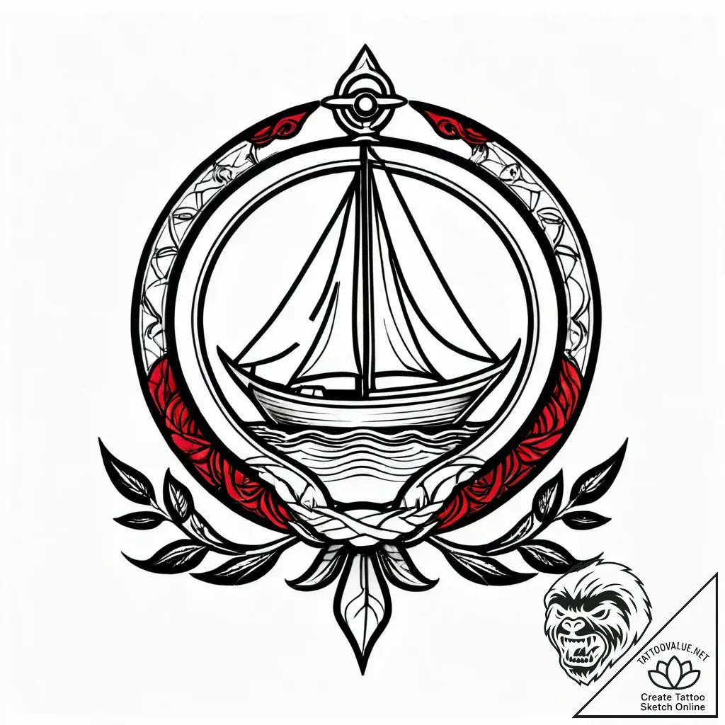 This sketch masterfully blends the bold, graphic style of American Traditional tattooing with the delicate linework of single-needle art. A proud sailboat, suspended within a circular, ornate frame, rides upon stylized waves, all rendered with classic black and red ink. The composition evokes a sense of timeless adventure, a visual poem of the open sea.