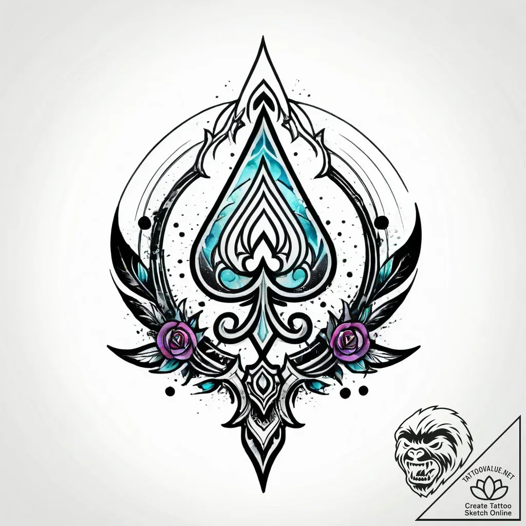 This sketch is a symphony of sharp lines and soft watercolor washes, a digital ghost of a gamer's soul rendered in muted, desaturated tones. The central ace of spades, a symbol of both risk and victory, blooms with an ethereal, watery glow, like a forgotten artifact unearthed from a digital realm. Delicate feathers and wilting roses, touched by the subtle blues and purples of a twilight sky, frame the emblem, evoking a sense of wistful nostalgia for digital battles won and lost.