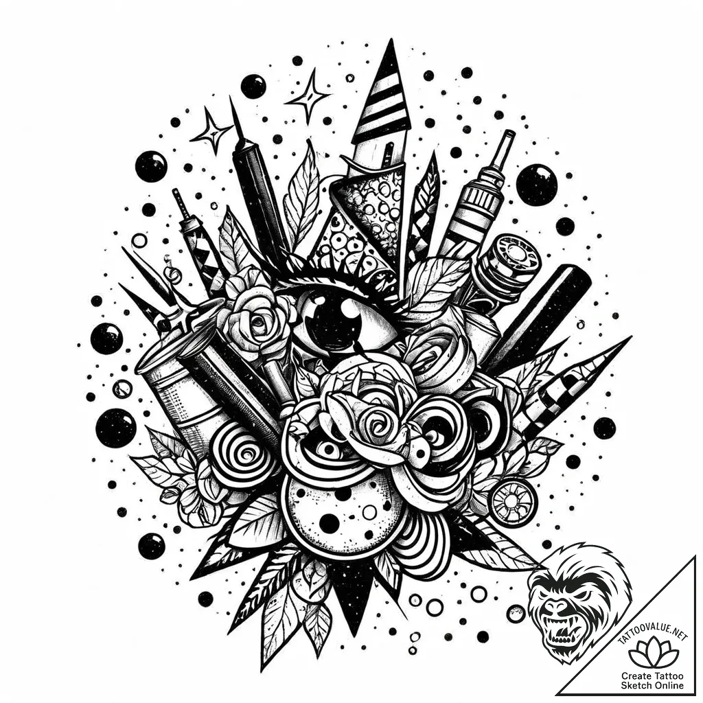 This design embodies a dynamic tension between observation and creation, the watchful eye suggesting awareness and insight, while the surrounding elements – perhaps representing tools, inspiration, or even vices – speak to the creative process and the often-unconventional journey of artistry. It can symbolize a bold, expressive personality that embraces complexity and the beauty found in the unexpected, a testament to embracing one's multifaceted nature.