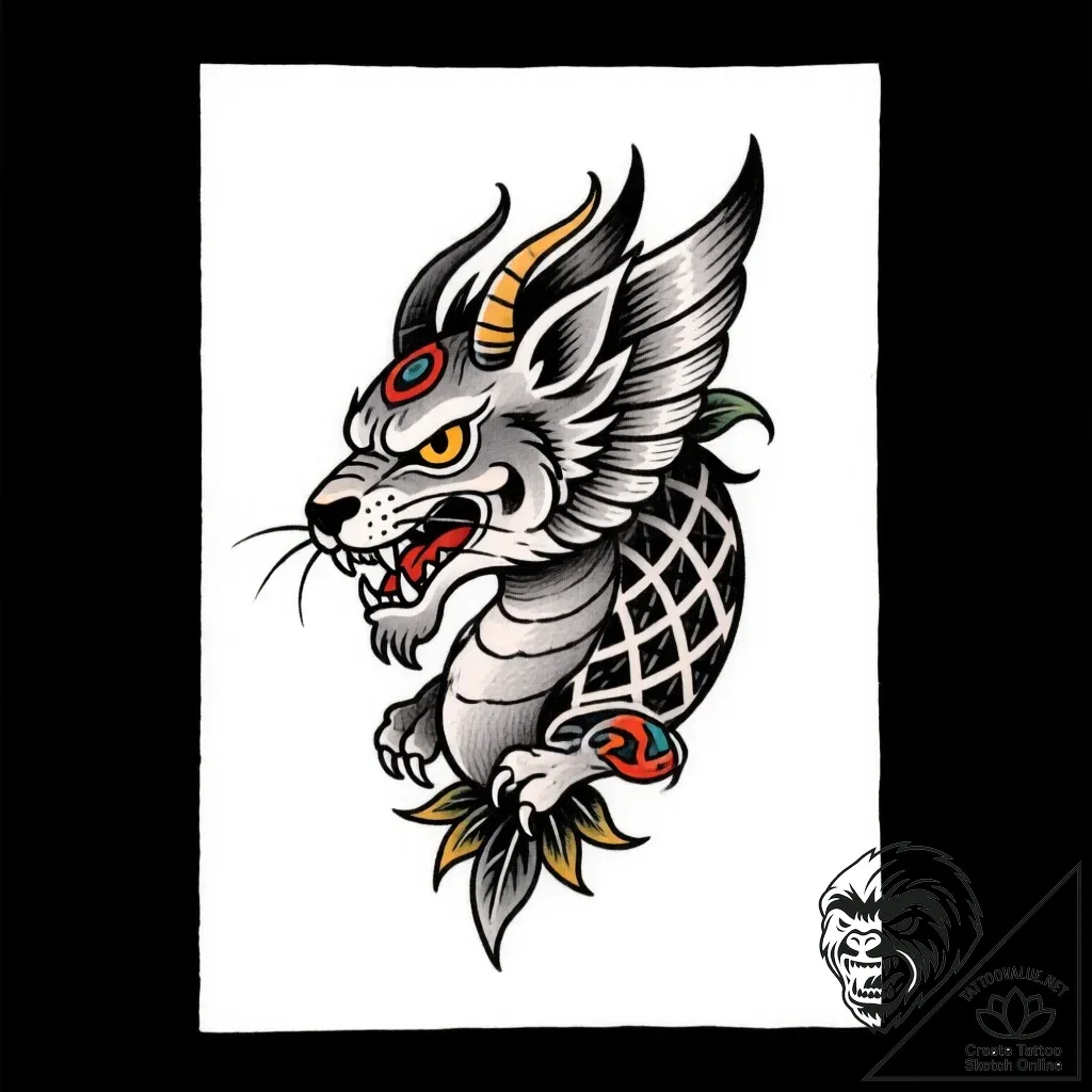 This neo-traditional dragon design is a powerful visual symphony, a storm contained within a flash sheet. Its photorealistic detail and soft shading create a tangible presence, while the bold lines and cross-hatching give it a raw, graphic energy. The vibrant colors pop like jewels scattered across a canvas of shadow and light, hinting at untamed power and ancient mystery.