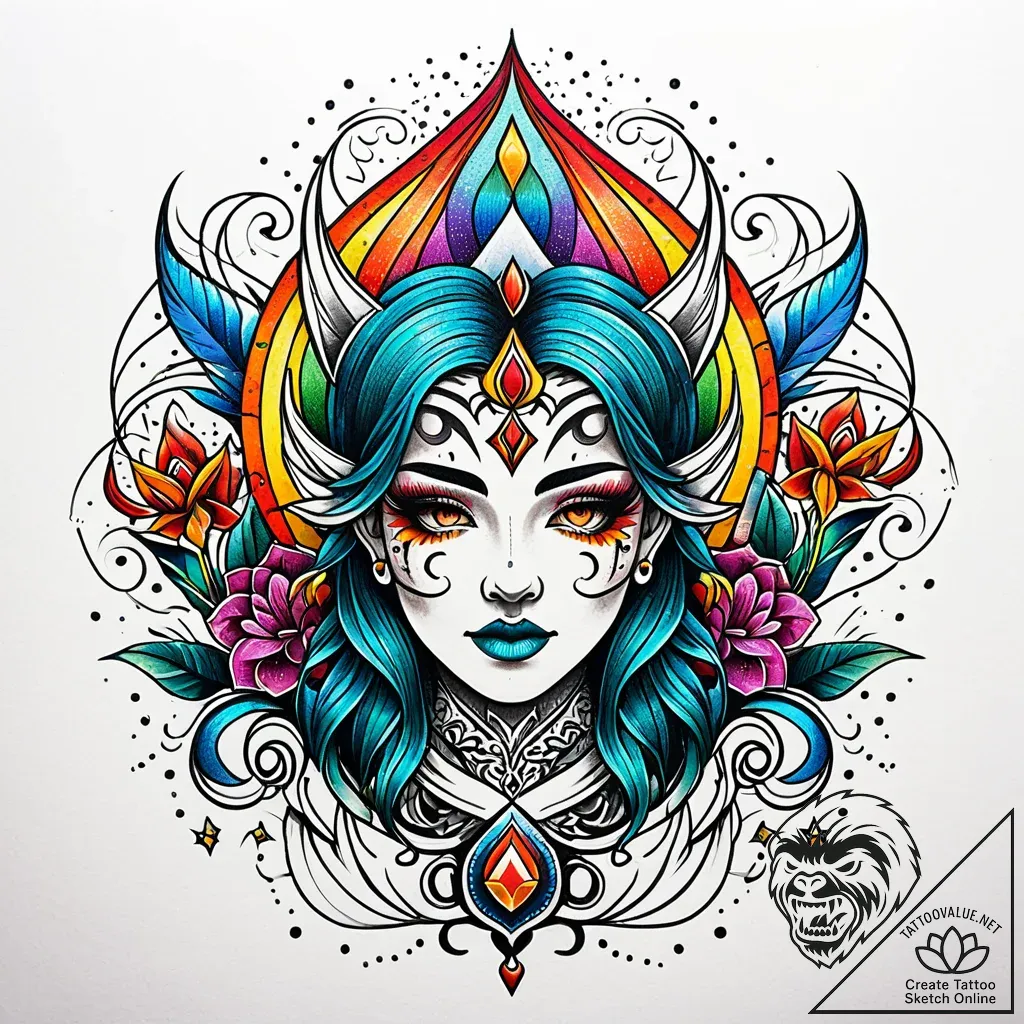 This Neo-traditional design is a vibrant explosion of color and form, where the ethereal gaze of a mystical figure is framed by a celestial headdress and blooming flora. The intricate dotwork and sti