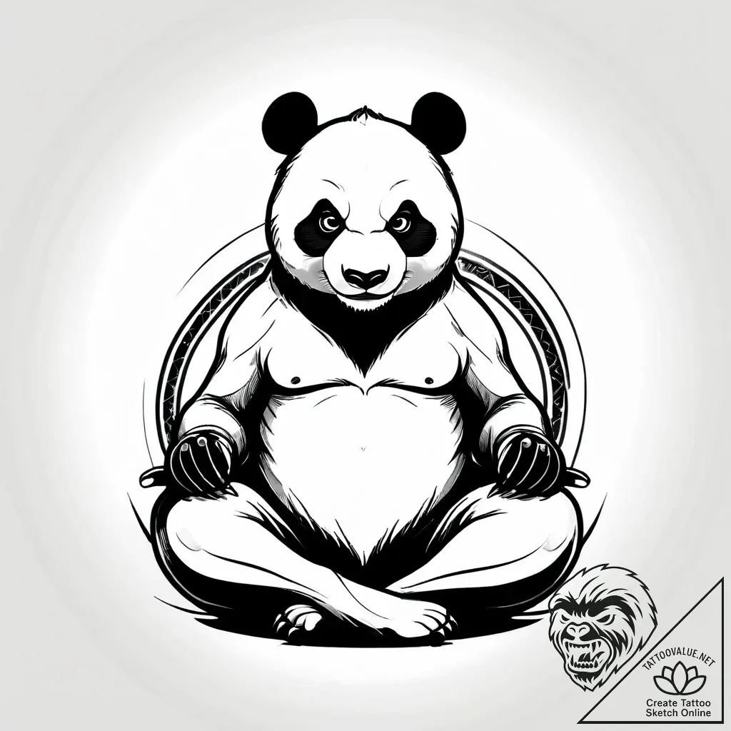 This striking black and white sketch captures a Kung Fu Panda in a meditative pose, rendered in a bold, graphic style with heavy linework and abstract realism, reminiscent of Trash Polka. The intense gaze and muscular physique, contrasted with the serene posture, create a powerful duality, evoking a sense of controlled ferocity and inner peace.