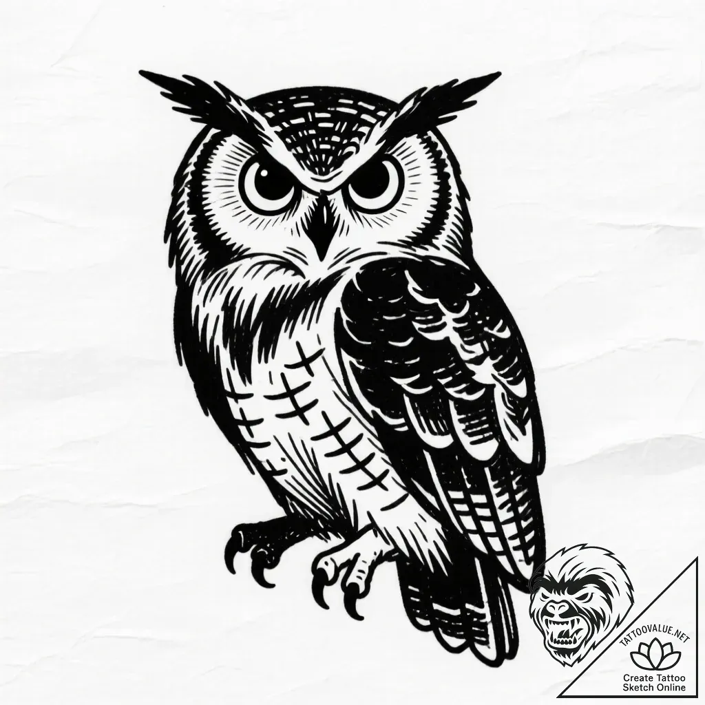 • Original User Request (RU): сова, ink illustration for tattoo, black and white sketch, monochrome, greyscale tones, sketch tattoo style, hand-drawn effect, rough lines, unfinished artistic look, cross-hatching, bold outlines, thick lines, heavy linework, on a clean white paper, isolated
