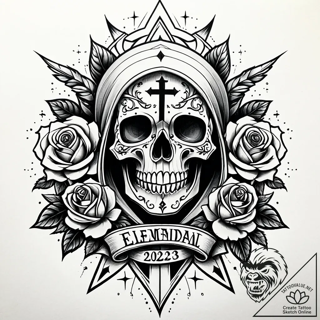 This striking Chicano-style tattoo sketch is a masterful blend of macabre and beauty, featuring a skull adorned with intricate Day of the Dead-inspired patterns, framed by lush roses and a symbolic cr