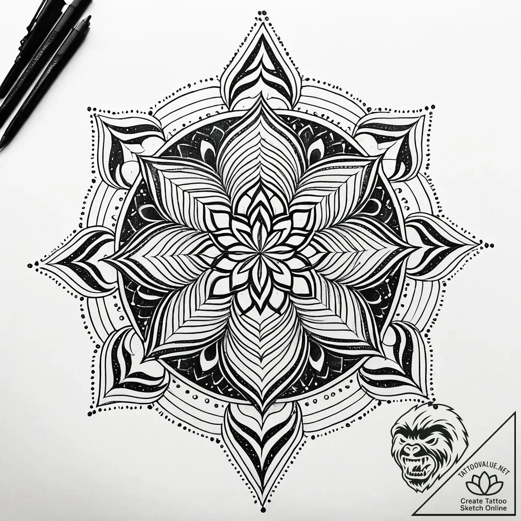 This geometric mandala sketch is a symphony of pure linework and stippling, creating a mesmerizing, almost celestial bloom. Each petal unfurls with intricate patterns, like a frozen moment of cosmic