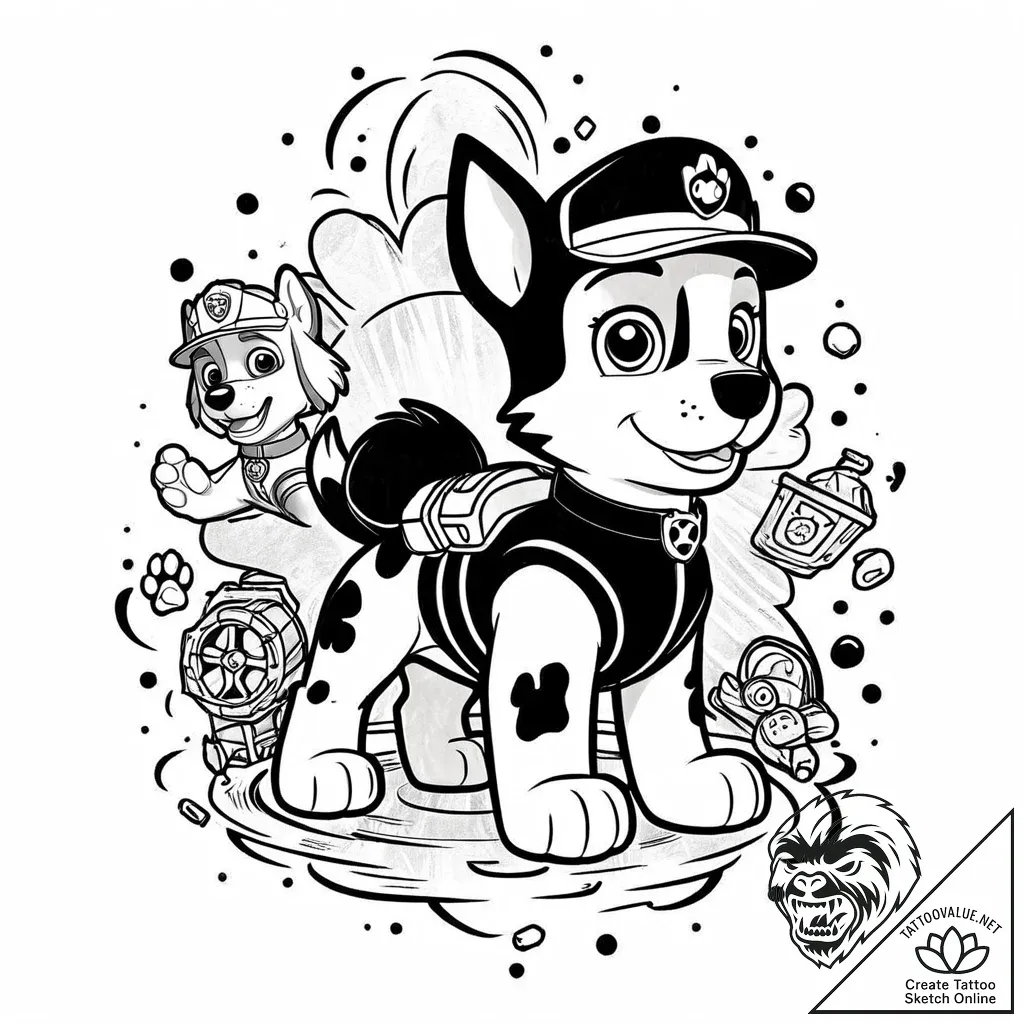 tattoo sketch, tattoo design, isolated tattoo sketch on pure white background, Paw Patrol: The Mighty Movie, artistic tattoo sketch, soft whip shading, pepper shading, smooth dot shading, on clean white paper, isolated, trash polka tattoo style, black and red ink, collage-like, abstract realism, graphic elements, sepia tone sketch, vintage paper look