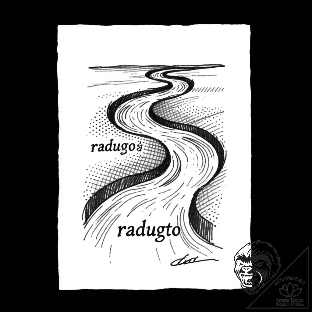 • Final Prompt for AI (EN): tattoo sketch, tattoo design, isolated tattoo sketch on pure white background, A tattoo design featuring a "raduga" rune depicted as a winding river or path, rendered in linework and flowing dotwork. The style is a black and white sketch, monochrome, with greyscale tones. It should appear as a tattoo drawing outline on clean white paper, isolated. The aesthetic is a sketch tattoo style with a hand-drawn effect, featuring rough lines and an unfinished artistic look. Incorporate cross-hatching, detailed cross-hatching shading, and pen and ink hatching for texture and depth.