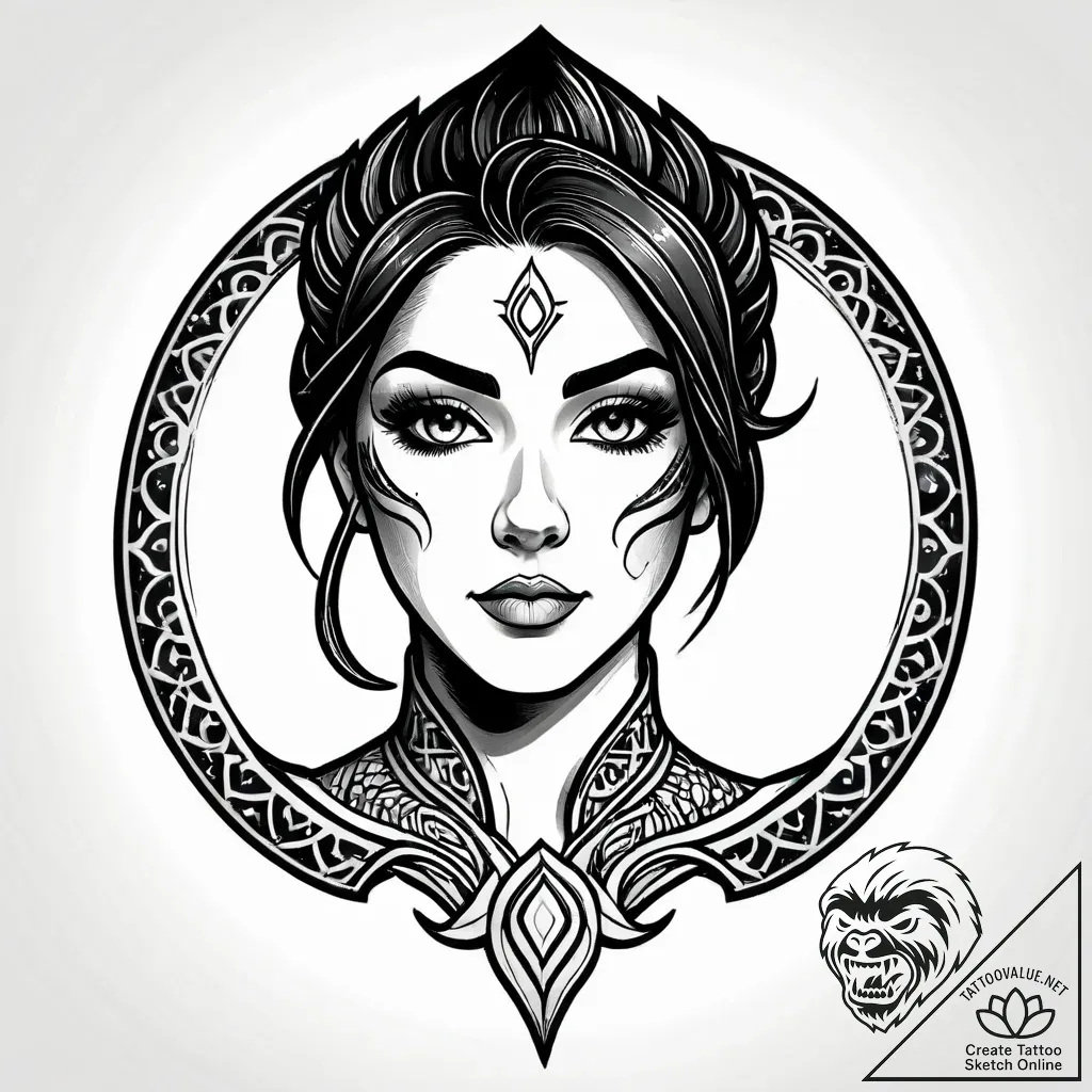 The character embodies strength, wisdom, and a fierce inner spirit, reminiscent of powerful female figures from mythology and fantasy. The intricate ornamentation suggests a deep connection to tradition and a refined aesthetic, while the piercing gaze speaks to intuition and determination, making it a symbol of personal empowerment and resilience.