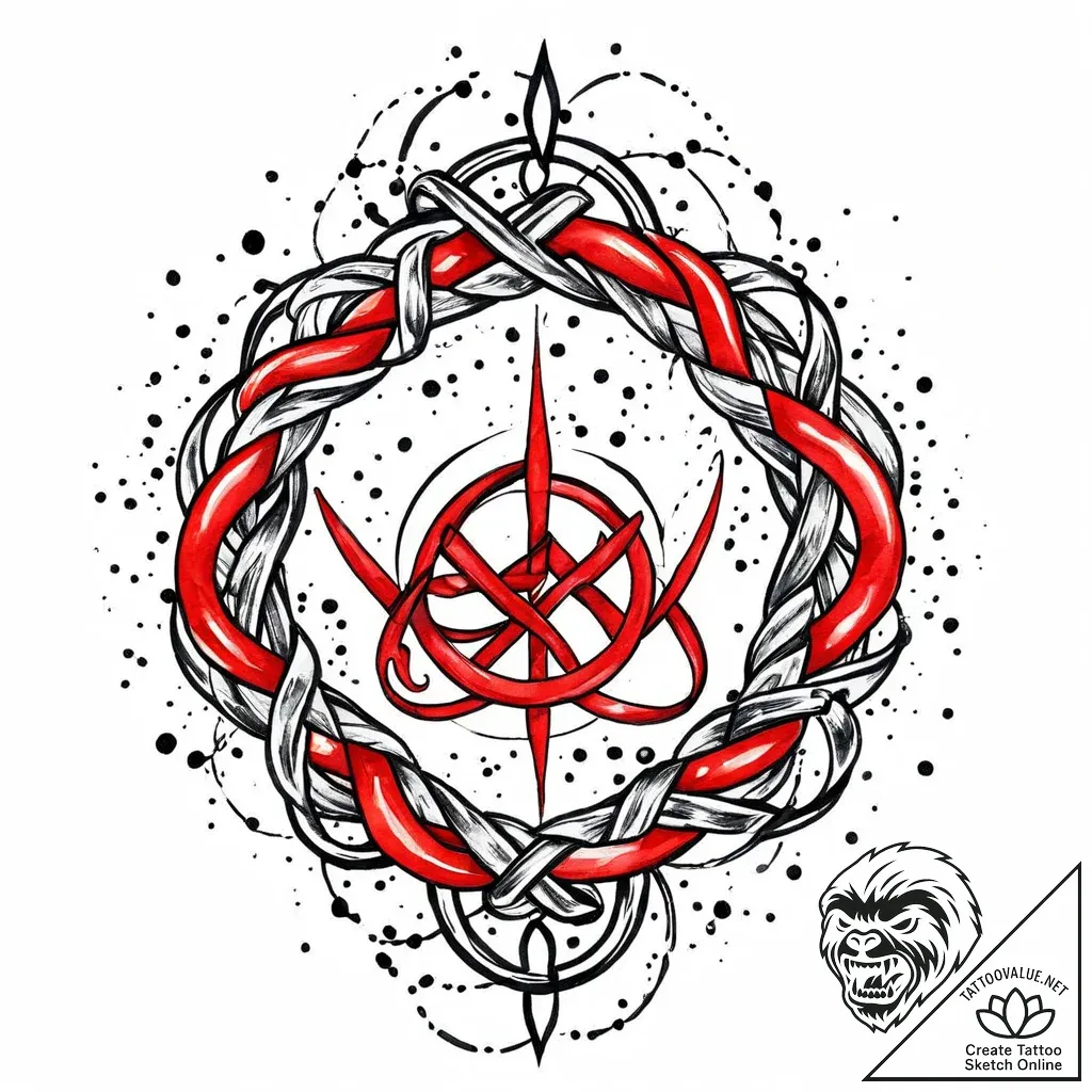 This neo-traditional design is a vibrant tapestry of interwoven elements, where the "Raduga" rune, a Slavic symbol of a rainbow and bridge between worlds, is cradled by a circular embrace of intertwined hands. The composition flows with abstract watercolor splashes and dynamic line art, creating a sense of ethereal energy and grounded connection. The dramatic two-tone effect, with bold black and striking red accents, evokes a powerful yet delicate balance.