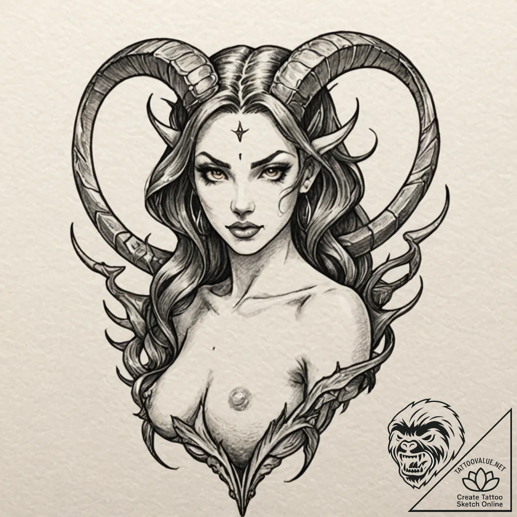 Your request “a beautiful, but deadly succubus, a symbol of dangerous seduction, tattoo sketch design, rough sketchy lines, hand-drawn pencil sketch effect, artistic unfinished look, on a clean white paper, isolated, new school tattoo style, vibrant colors, cartoonish, graffiti art inspired, exaggerated forms, sepia tone sketch, vintage paper look” has been realised in a new sketch at tattoovalue.net.