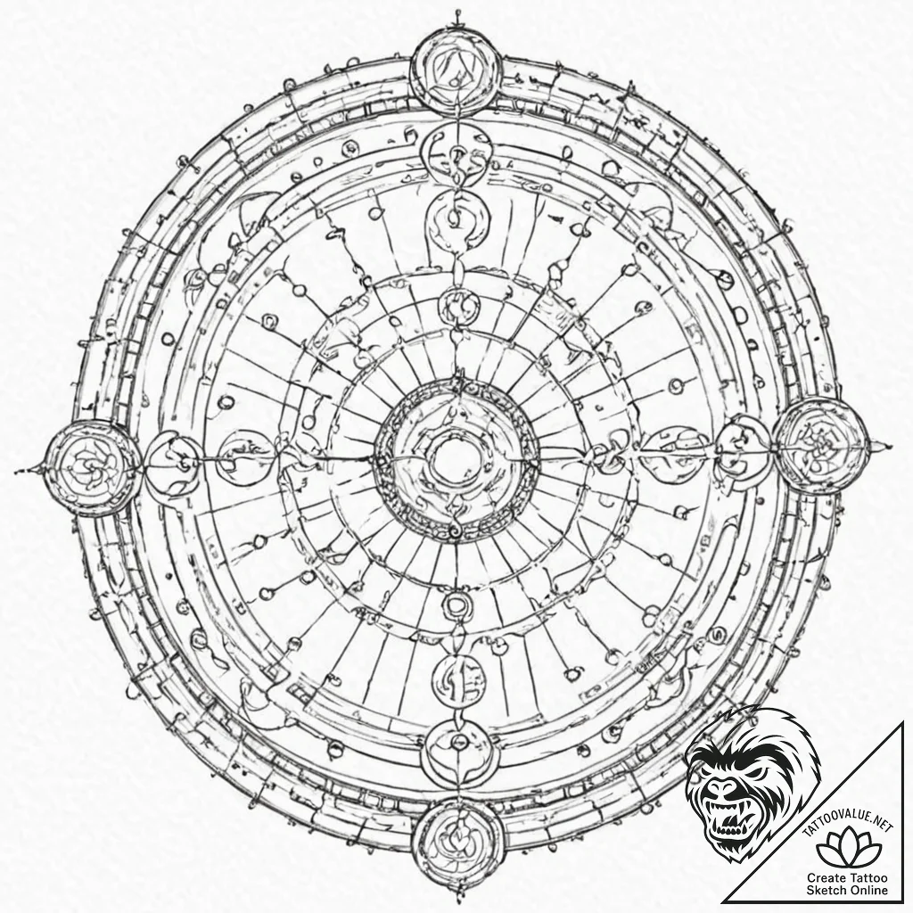 Your request “a beautiful, ornate astrolabe, for mapping the heavens and one's place within them, artistic tattoo sketch, muted color palette, desaturated colors, vintage tattoo feel, dotwork tattoo style, stippling art, pointillism, geometric dotwork, on a clean white paper, isolated, fine lines, delicate linework, single needle style” has been realised in a new sketch at tattoovalue.net.