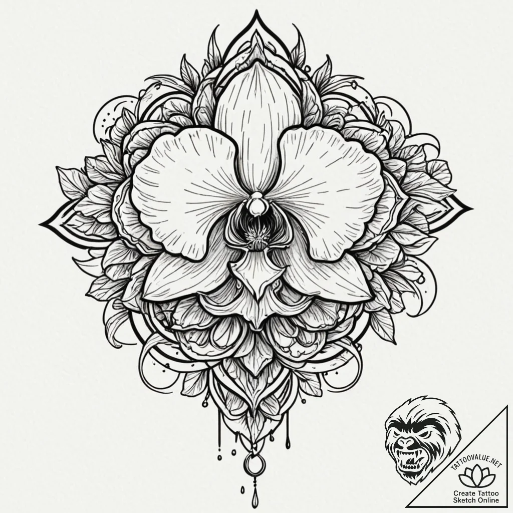 This stylish design inspired by “a beautiful, realistic black orchid, exotic and rare, tattoo flash sheet design, vibrant colors, full color spectrum, bold bright tattoo inks, neo traditional tattoo, illustrative, art nouveau influence, detailed, rich colors, fine lines, delicate linework, single needle style, on a clean white paper, isolated” was generated especially for you at tattoovalue.net.