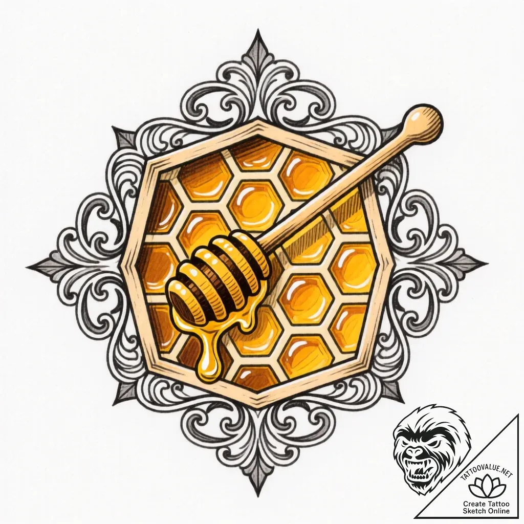 This tattoo sketch is a golden echo of nature's artistry, a meticulously rendered scene of a beekeeper's gentle interaction with the hive. The honeycomb, brimming with luminous honey, is framed by an