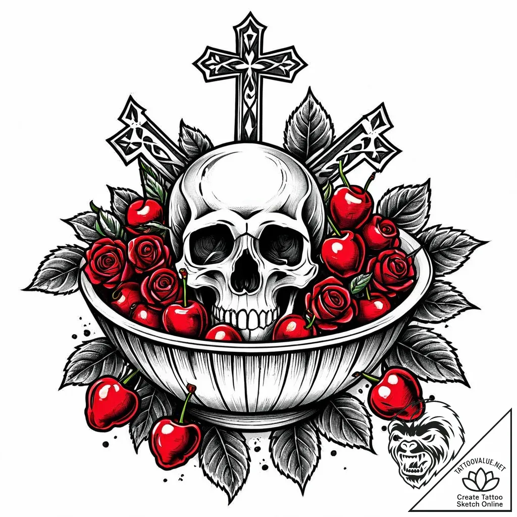This design is a potent memento mori, symbolizing the transient nature of life and the beauty found even in mortality. The skull represents death and the unknown, while the cherries and roses signify life, love, and pleasure, suggesting a celebration of the present moment and the richness of experiences. The crosses add a layer of spiritual contemplation or perhaps a nod to faith and destiny.