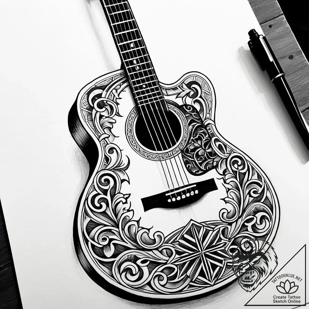 - Original User Request (RU): a close-up of the intricate fretwork on an acoustic guitar., artistic tattoo sketch, on a clean white paper, isolated, detailed cross-hatching shading, pen and ink hatching, realistic black and grey tattoo, photorealistic detail, soft shading, black and white sketch, monochrome, greyscale tones