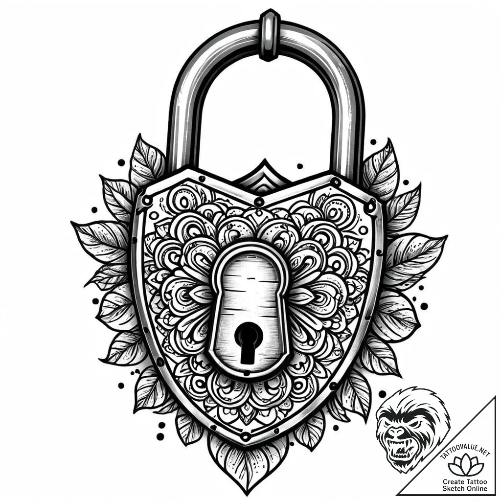 This meticulously crafted tattoo sketch presents an antique padlock, its metallic sheen rendered through delicate whip shading and smooth dotwork gradients, evoking a sense of enduring history. Encased within its shield-like body is an intricate mandala, a floral tapestry of blackwork and stippling that whispers tales of hidden beauty and protected secrets. The composition, grounded by the solid form of the lock and softened by surrounding leaves, creates a harmonious balance between strength and organic elegance.