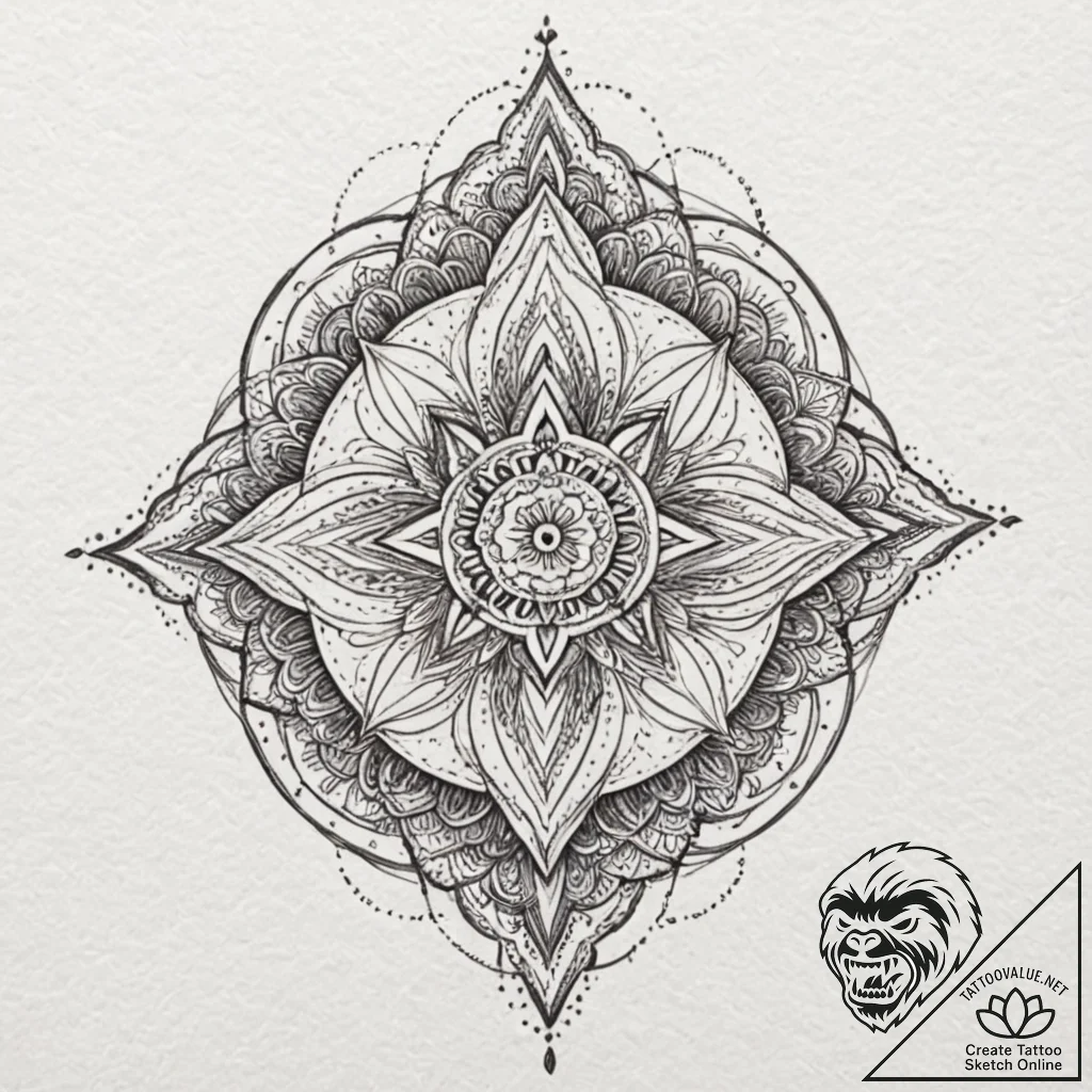 This unusual design inspired by “a girl whose body is made of stardust and nebulae, tattoo sketch design, on a clean white paper, isolated, geometric tattoo style, sacred geometry patterns, mandalas, abstract shapes, symmetrical, detailed cross-hatching shading, pen and ink hatching, sepia tone sketch, vintage paper look” was generated especially for you at tattoovalue.net.