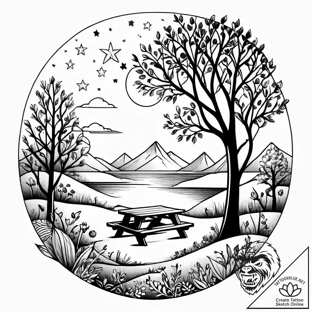 This tattoo design symbolizes cherished family moments, simple joys, and the enduring comfort of nature. It represents a deep appreciation for connection, tradition, and the peaceful passage of time. Choosing this design can signify a person who values their roots, cherishes memories, and finds solace in the tranquility of the outdoors.