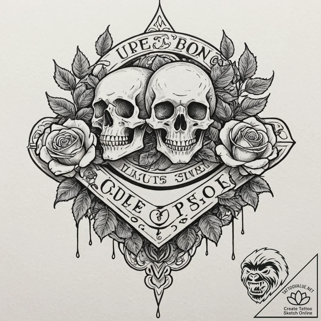 This interesting design inspired by “a graphic novel panel of the gate to the upside down, a glowing red rift,, tattoo sketch design, chicano tattoo style, fine line black and grey, religious iconography, lettering, roses, skulls, subtle drop shadow, object casting a light shadow, black outline only, pure linework, no shading, moderately detailed, balanced complexity, clear subject definition, dotwork shading, stippling texture, pointillism effect for tattoo” was generated especially for you at tattoovalue.net.