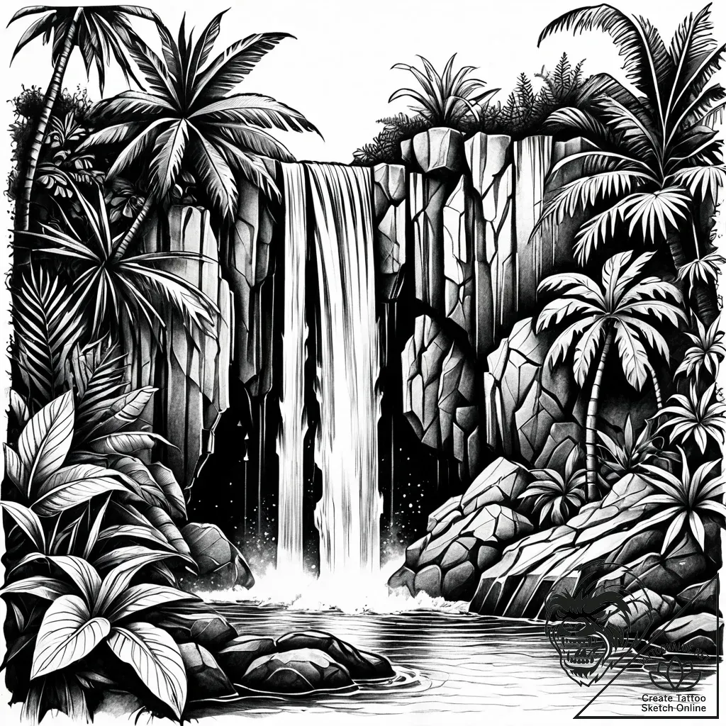 This tattoo sketch unveils a hidden sanctuary, a tropical grotto where a waterfall cascades like liquid moonlight. The design is a masterful blend of blackwork and detailed shading, employing cross-ha