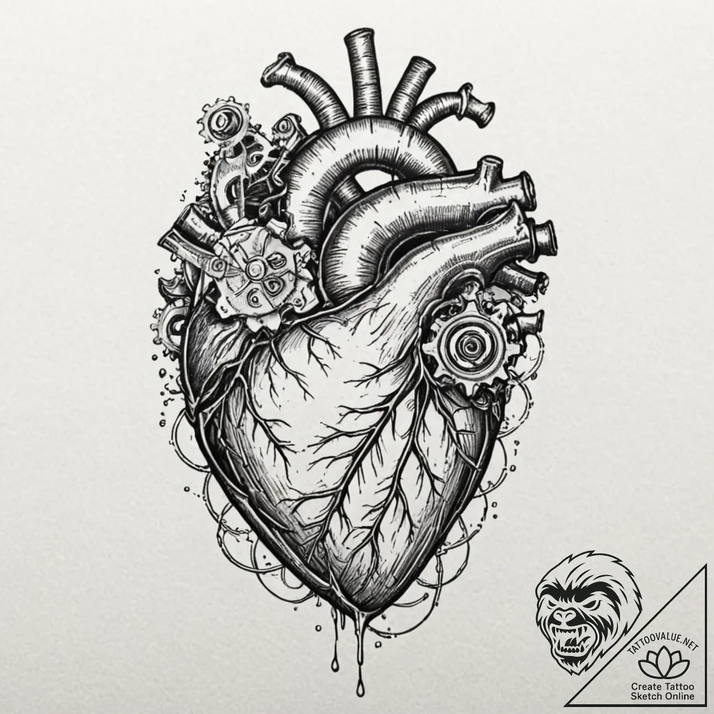A human heart, but it is a complex, cold mach… – tattoo sketch (№1752098756_0, 09.07.2025 22:05) — tattoovalue.net