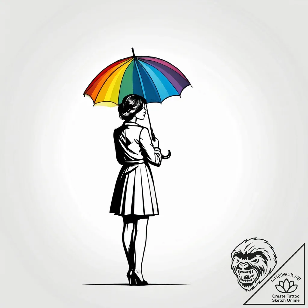 The lone figure symbolizes resilience and personal strength in the face of adversity, like standing firm in a storm. The rainbow umbrella represents optimism, diversity, and the celebration of individuality, shining brightly even in the 'foggy' or challenging moments of life. This tattoo can emphasize traits of independence, hopefulness, and the courage to embrace one's unique spectrum of colors.