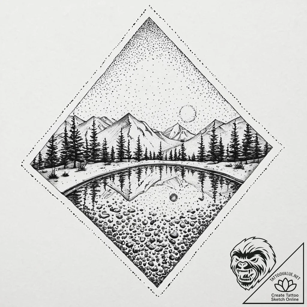 Presenting a unique tattoo sketch, generated based on your request “a minimalist drawing of a private infinity pool, tattoo drawing outline, muted color palette, desaturated colors, vintage tattoo feel, on a clean white paper, isolated, dotwork shading, stippling texture, pointillism effect for tattoo, dotwork tattoo style, stippling art, pointillism, geometric dotwork” at tattoovalue.net.