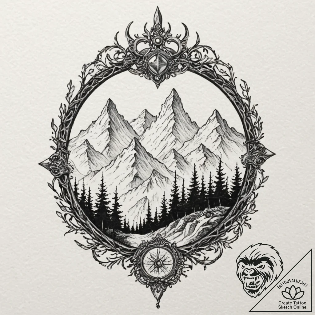 This stylish design inspired by “a minimalist tattoo of the three peaks of moria, with the crown of durin., tattoo sketch design, blackwork tattoo style, dark art, bold black areas, heavy black ink, moderately detailed, balanced complexity, clear subject definition, aesthetically pleasing, beautiful design, sepia tone sketch, vintage paper look, on white paper, clean white background, isolated on white, dotwork shading, stippling texture, pointillism effect for tattoo” was created especially for you at tattoovalue.net.