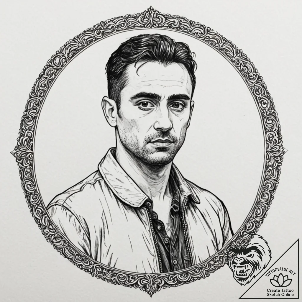 This interesting design inspired by “a neo-traditional portrait of the main character from taxi driver, travis bickle, looking in the mirror,, artistic tattoo sketch, fine lines, delicate linework, single needle style, subtle drop shadow, object casting a light shadow, moderately detailed, balanced complexity, clear subject definition, black and grey tattoo shading, smooth gradients, ornamental tattoo, decorative patterns, filigree, intricate details, flowing patterns” was prepared especially for you at tattoovalue.net.