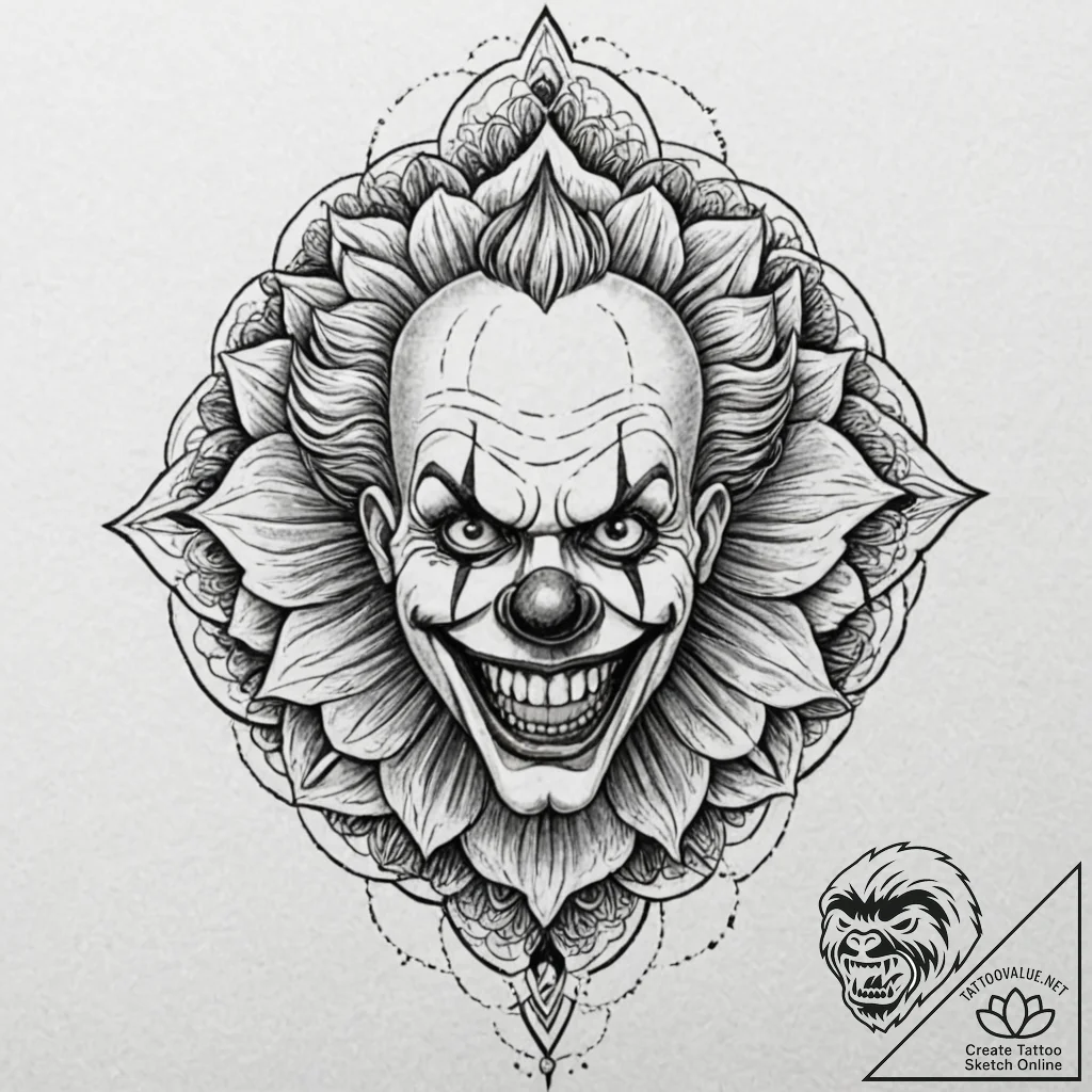This interesting design inspired by “a neo-traditional tattoo of the clown from clown, transforming and horrifying,, tattoo flash sheet design, stylized interpretation, graphic style, artistic stylization, black and white sketch, monochrome, greyscale tones, clean lines, crisp outlines, sharp linework, masterpiece, best quality, top-tier, aesthetically pleasing, beautiful design, studio lighting presentation, professional sketch display, geometric tattoo style, sacred geometry patterns, mandalas, abstract shapes, symmetrical” was created especially for you at tattoovalue.net.