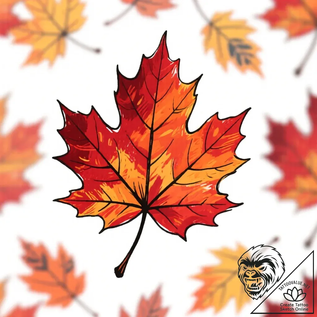 tattoo sketch, tattoo design, isolated tattoo sketch on pure white background, A seamless pattern of vibrant, falling autumn leaves, rendered in a painterly style, with a rich color palette of reds, oranges, and yellows against a soft, blurred background.