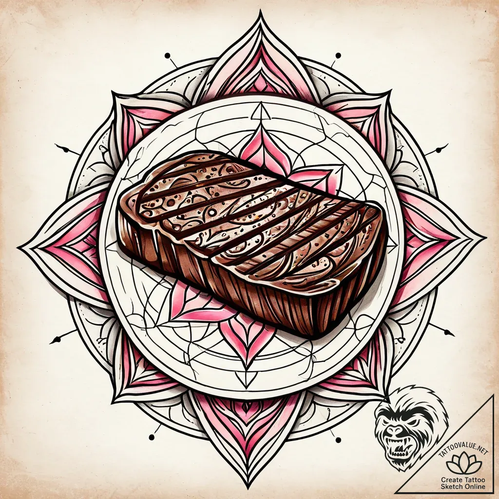 This striking tattoo sketch masterfully blends the primal allure of a perfectly grilled steak with the intricate beauty of sacred geometry. The sepia-toned rendering, reminiscent of aged parchment, showcases a succulent steak, its pink interior hinting at a rich, satisfying core, all presented within the symmetrical embrace of a mandala-like design featuring delicate petal shapes and geometric linework.