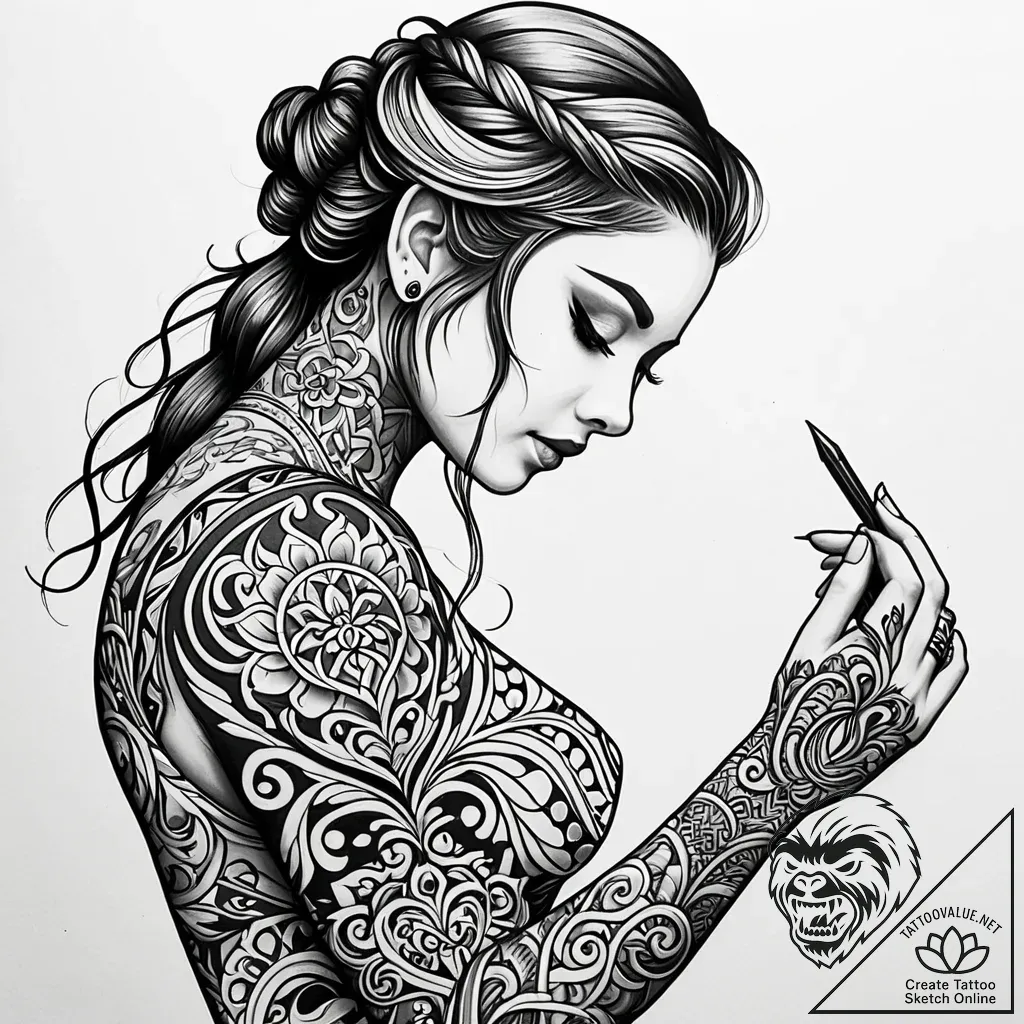 This design symbolizes a profound connection to artistry and self-expression, suggesting a wearer who embraces complexity and finds beauty in the intricate details of life. The flowing ornamentations can represent personal growth, transformation, and the enduring power of creative spirit.