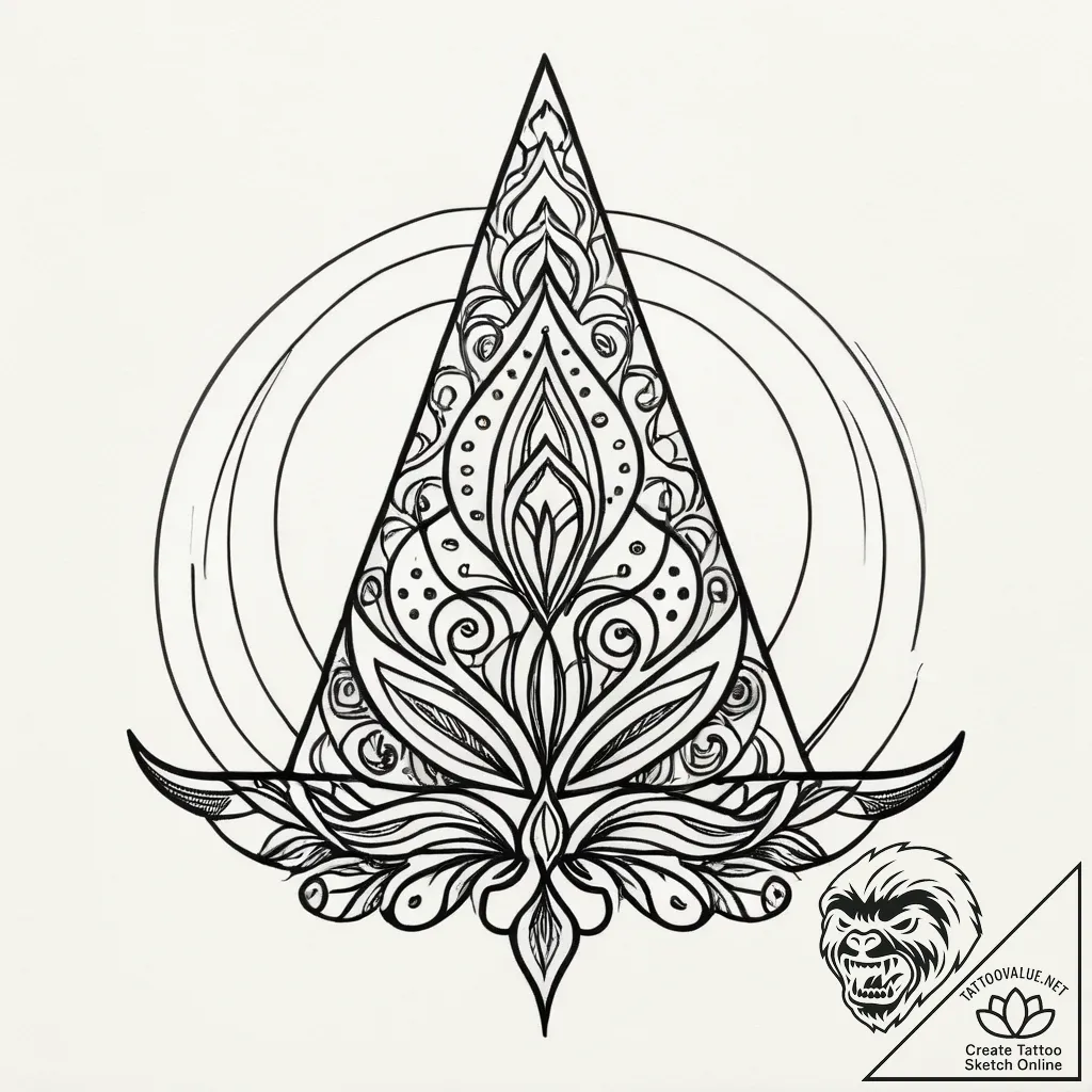 This tattoo sketch is a captivating dance between precision and delicacy, rendered in a sepia-toned pointillist style reminiscent of vintage botanical illustrations. The central arrowhead form, intricately filled with swirling floral and organic motifs, feels both ancient and modern, anchored by concentric circles that suggest growth and expansion. It’s a graphic piece with dotwork elements, evoking a sense of quiet contemplation and refined artistry.